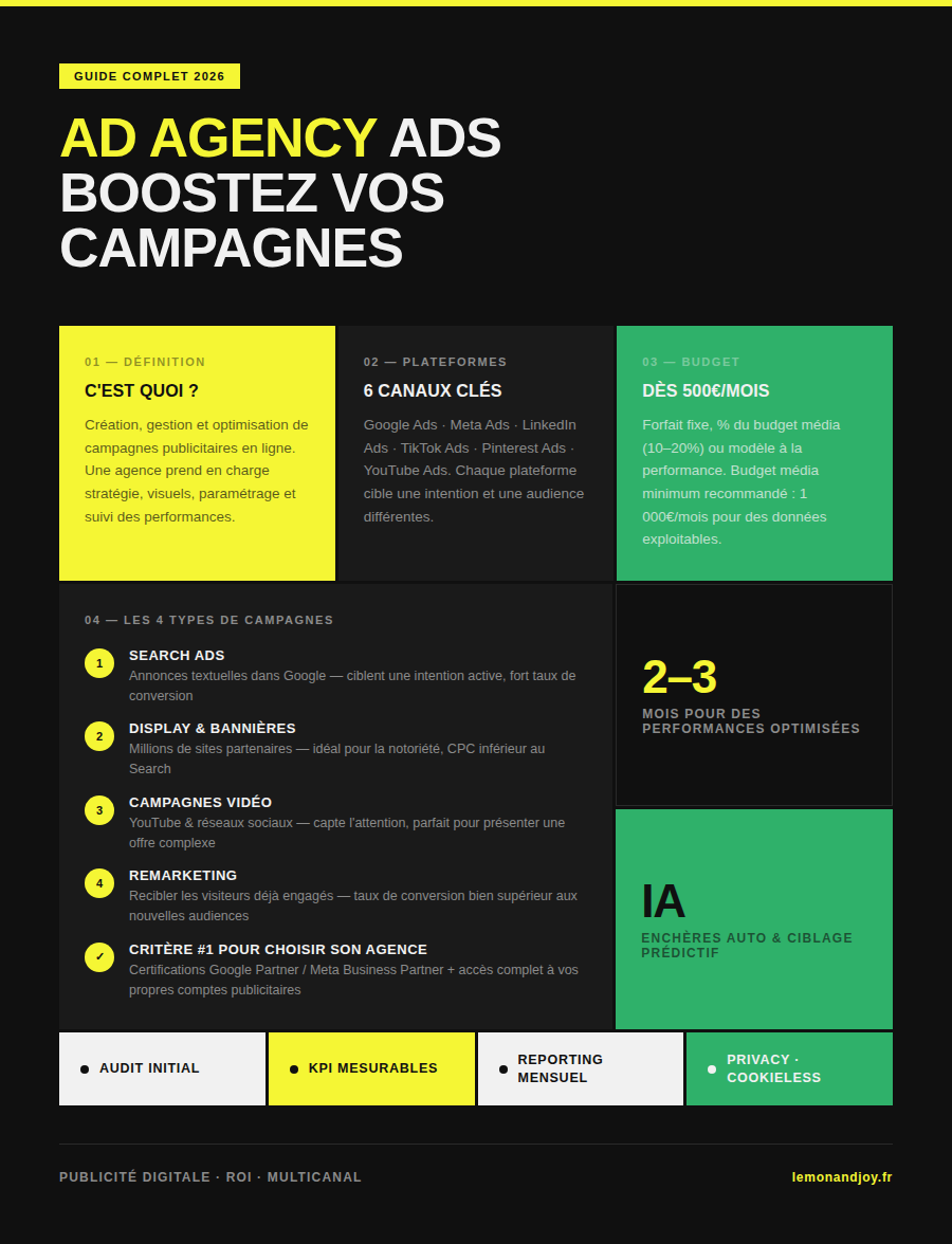 Les ad agency ads représentent aujourd’hui un levier incontournable pour développer votre activité en ligne. Que vous soyez une TPE, une PME ou un entrepreneur ambitieux, maîtriser la publicité digitale devient essentiel. Découvrez comment une agence spécialisée peut transformer vos investissements publicitaires en résultats concrets.