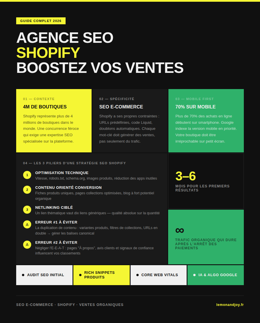 Shopify possède une architecture particulière. Les URLs sont prédéfinies. La structure des collections suit un schéma précis. Le code source présente des contraintes uniques.